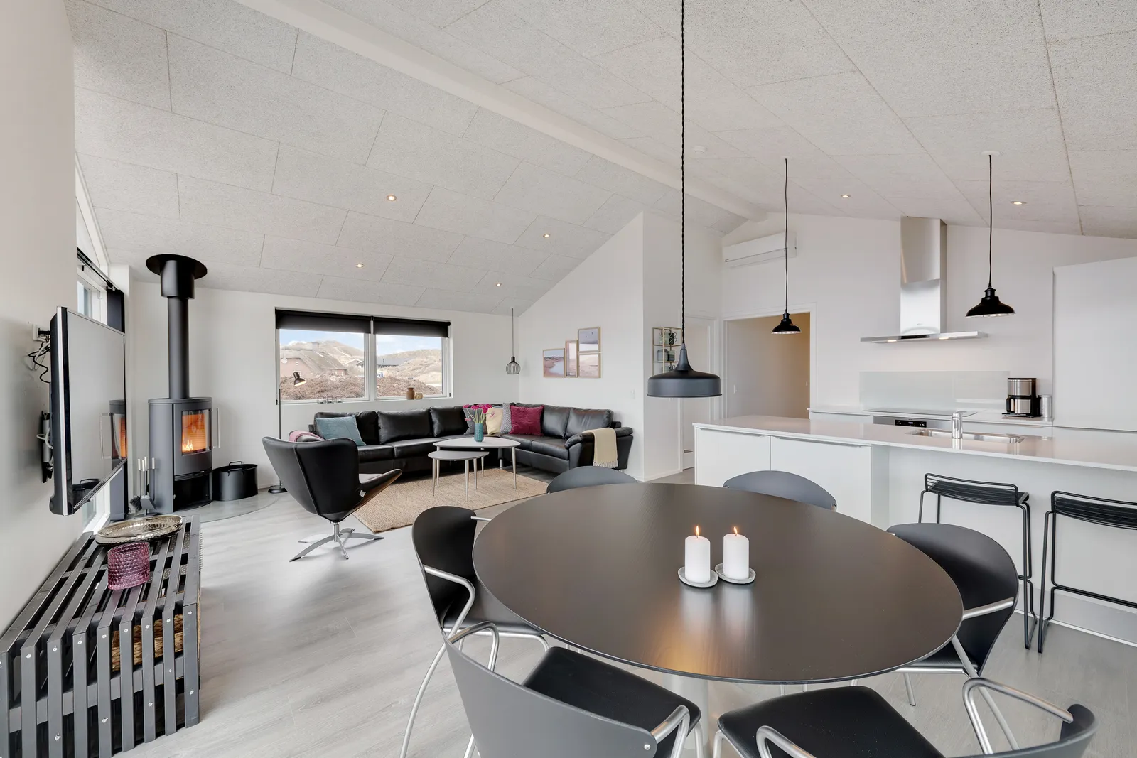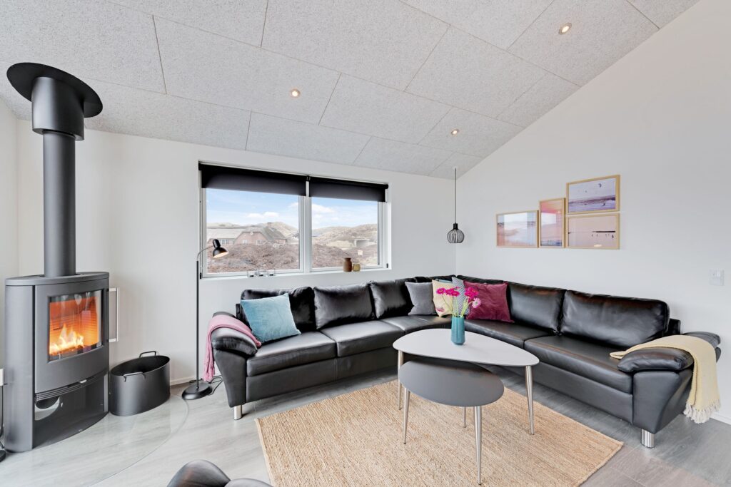 Skønt sofahjørne ved siden af brændeovnen. Foto: Esmark Feriehusudlejning.