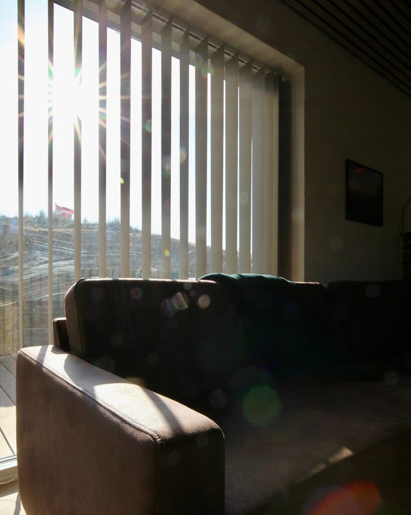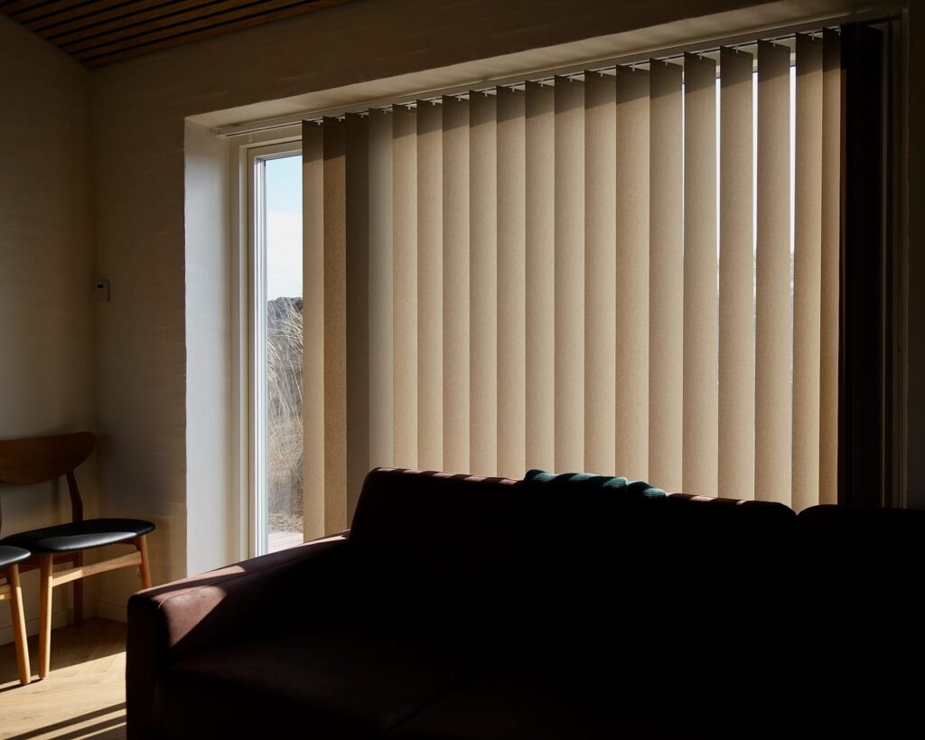 Moderne sommerhuse har typisk store glaspartier. Her er lamelgardiner et oplagt valg.