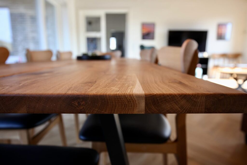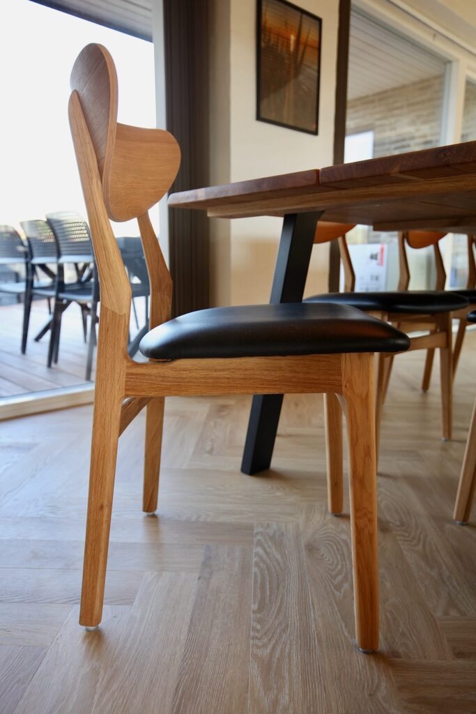 Det flotte spisemøblement, med både borde og spisestole i oliebehandlet massivtræ.