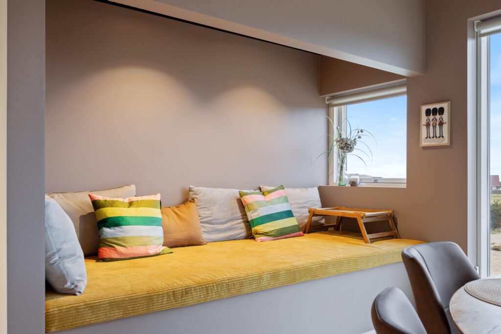 Et særligt element i huset er den indbyggede alkove, hvor vi har syet en specialtilpasset hynde i samme stof som sofaen. Alkoven skaber et hyggeligt hjørne, der indbyder til fordybelse og rolige stunder med udsigt.