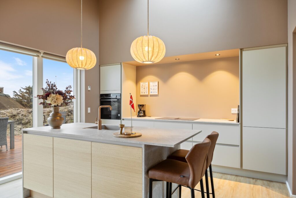I de åbne opholdsrum er møblerne valgt til at passe naturligt sammen med husets moderne arkitektur, de store vinduespartier og det smukke træliste-loft. Der er tænkt i helhed og sammenhæng, så hvert rum inviterer til afslapning og samvær.